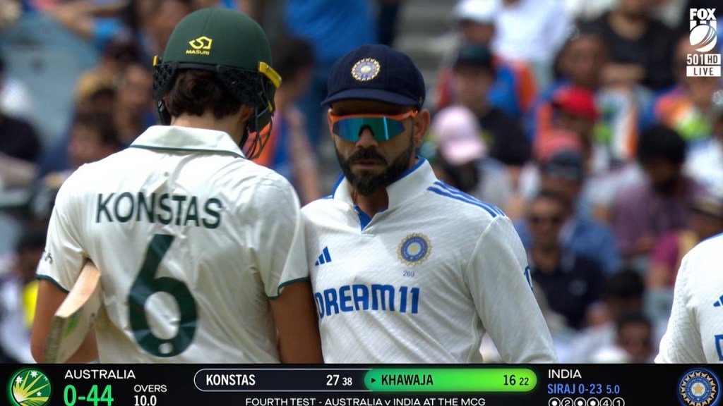Picking up the ball at the end of an over Kohli strode purposely towards the pitch where young Konstas was walking down the fringe to compare notes with his batting partner. Konstas held is line as Kohli straightened, their shoulders colliding with all the impact of two old ladies jockeying for position in the queue for the bistro. Konstas turned to question his idol’s intentions. Kohli showed him and the gathering parties of interest that he was merely delivering the ball to the next bowler. He further indicated that he felt Konstas had been the aggressor.